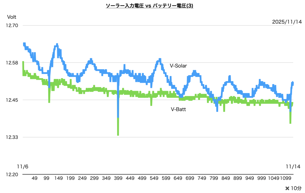 こんな感じです、ソーラー電圧は日中の光を受けて電力発生している時間帯にはピークが見えます、この先継続しても12.4V程度は下回りそうにないので十分に効果はあると言えそうです、発電量が一番低下するのは太陽の高度から冬至の頃だからその頃に再度ログ取ってみようかと思う
