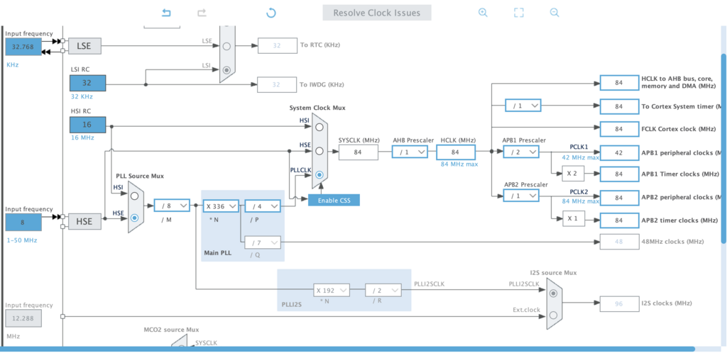 で、ST-Linkの水晶使って最大動作周波数に設定した時のコンフィグは以下の通り