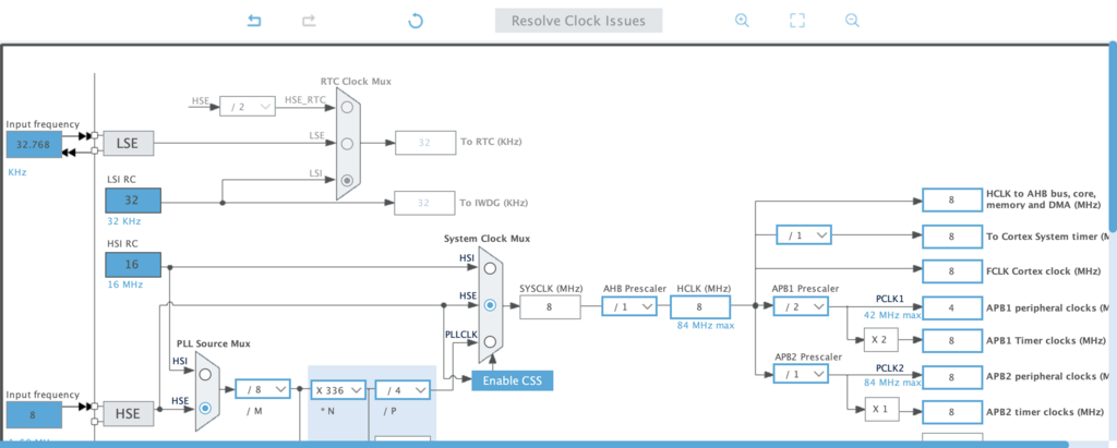 ・APB1:peripheralは低速の周辺デバイスI2C, USART2/3, SPI2/3, CAN, PWR などで最大42MHz、timer clockはTim2~7用