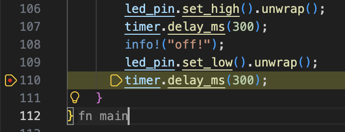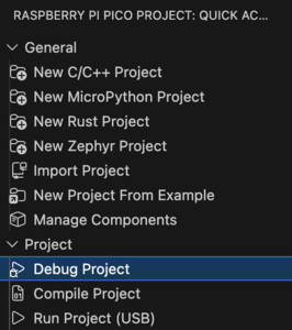 この状態でほぼすぐにデバッグができました、Runはファイルモードでしか機能しませんがデバッグは上位互換なので問題なし、デバッグだと.uf2のファイルも必要なくて、バイナリそのままがラズピコに書き込まれます