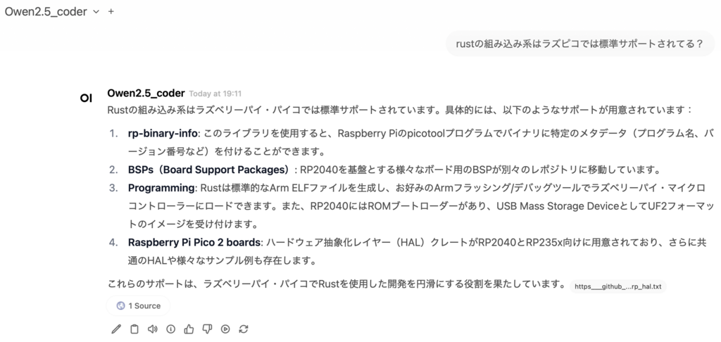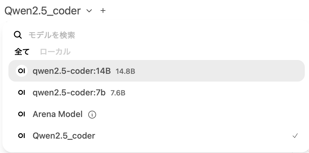 以下のイメージはチャットモードで作成済みのLocal LLM qwen2.5-coder:14B + RAGのモデル(Qwen2.5)がモデル選択メニューから見えてるとこ
