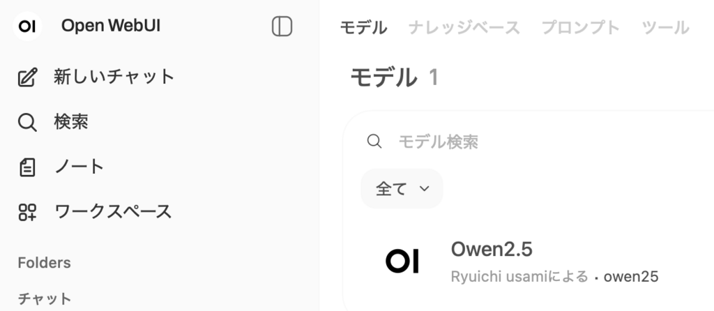 で、このモデルの作り方は、ワークスペースを選択するとこの画面になります、今現在入力しているのは「モデル」と「ナレッジベース」だけ、プロンプトとツールは必要になった時点で追加します、モデルそのものは画面右上のNew Modelボタンを押して作成します