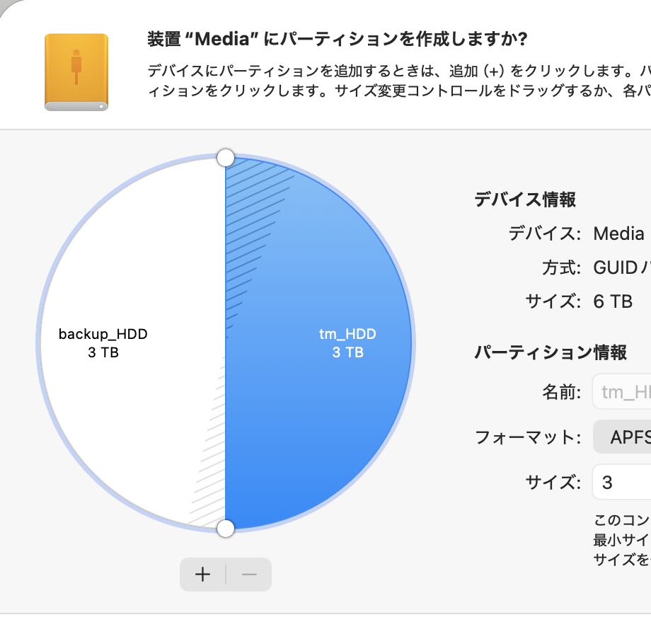 timemachineで6Tは必要ないからパーティション切って3Tをtimemachineに割り当て、
